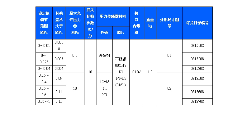 501/7DZ雙觸點(diǎn)壓力控制器采用膜片式的傳感器,可用于中性氣體、液體介質(zhì),部分規(guī)格可用于腐蝕性介質(zhì)。501/7DZ雙觸點(diǎn)壓力控制器設(shè)定值可調(diào),調(diào)節(jié)范圍0~1MPa。